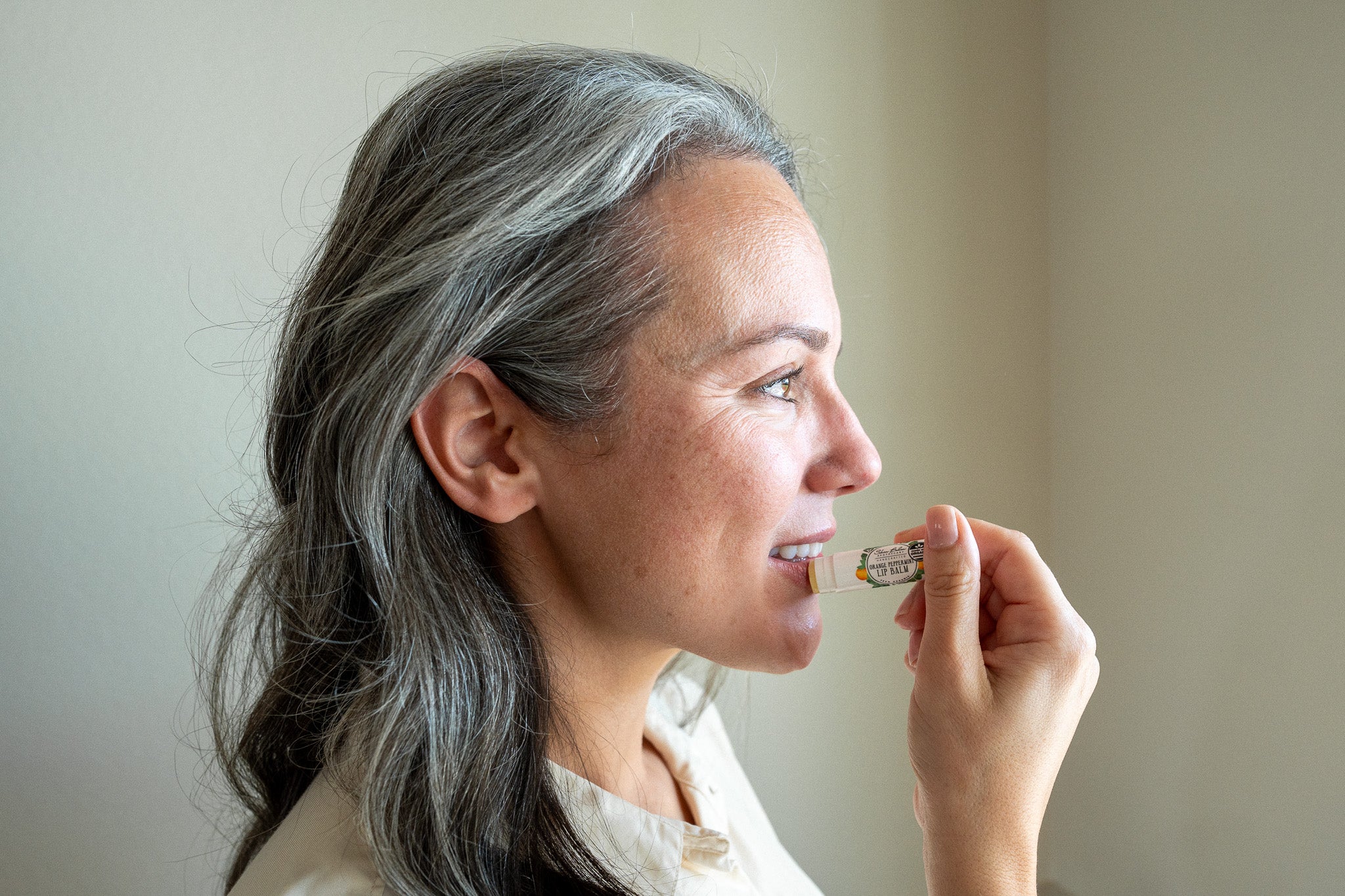 A smiling woman holds a jar of the Sweet Dreams Glow Balm while applying it to her face.