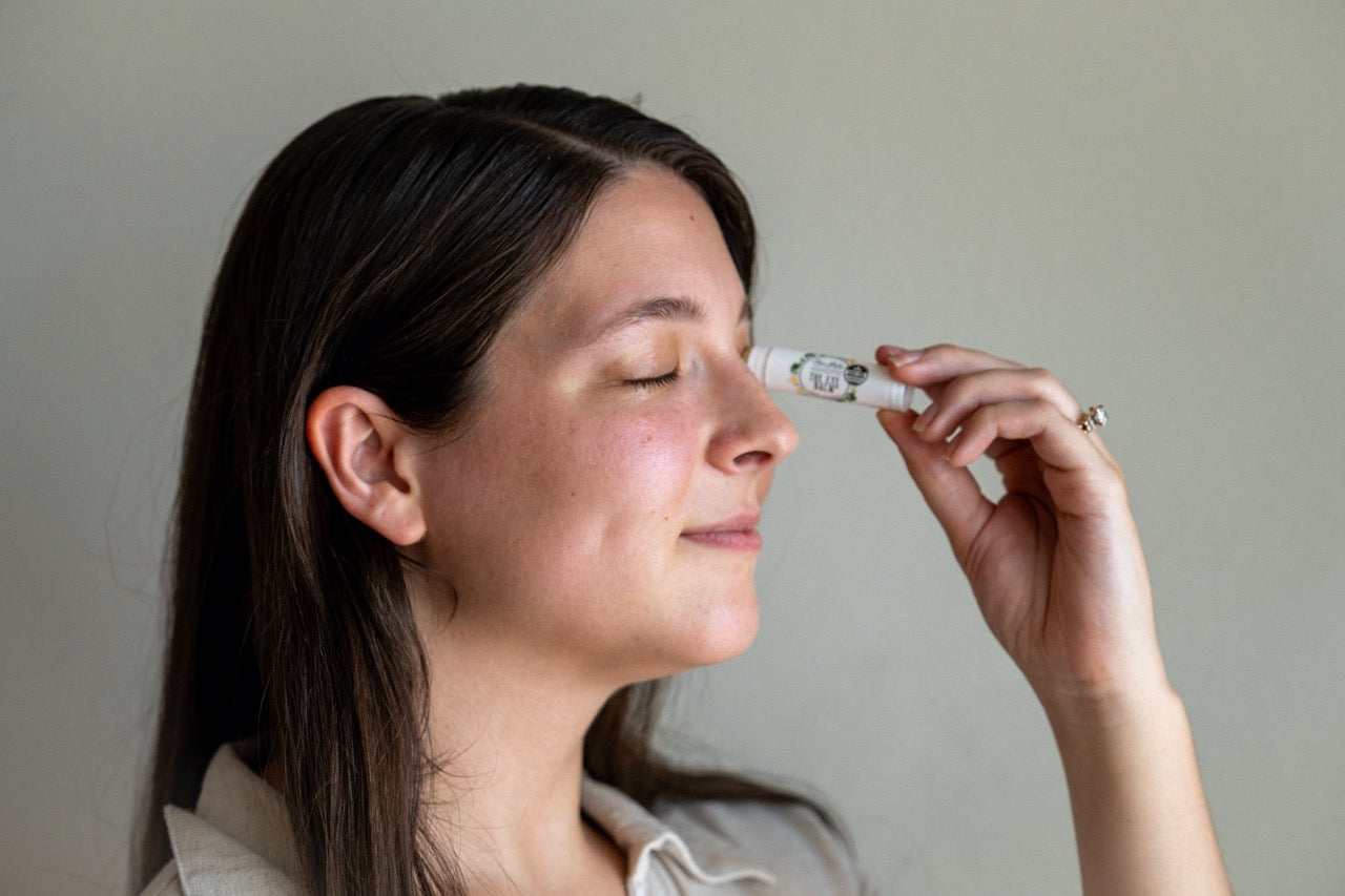 A close-up shot of a woman applying The Eye Balm™ to her eyebrows.