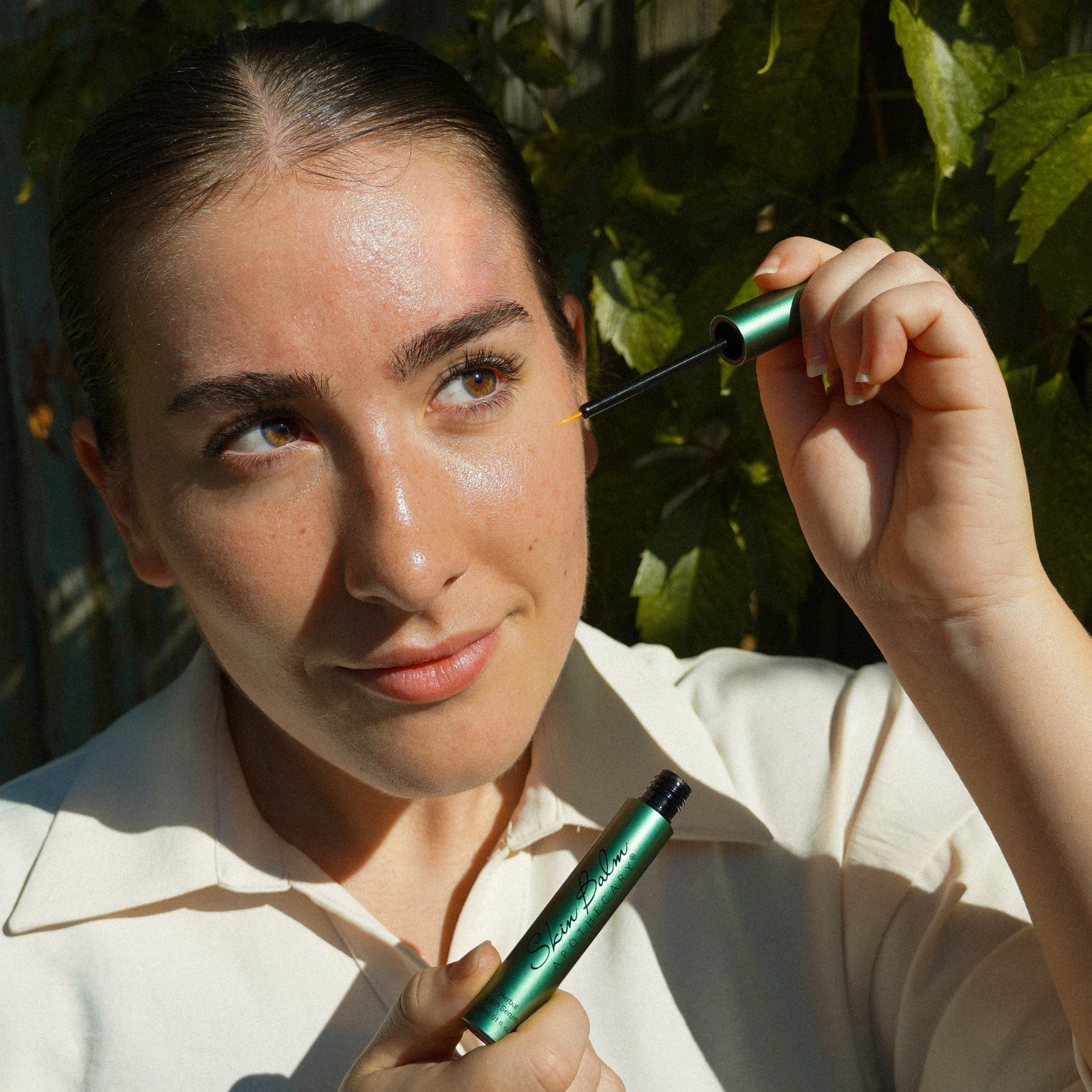 A close-up shot of a woman applying The Eye Balm™ to her eyebrows.